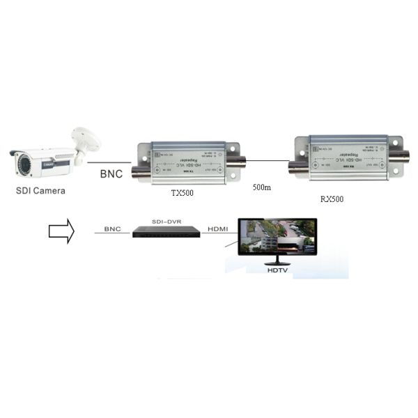 This SDI extender over coax includes transmitter and receiver. TX500 is to apply for signal transmitting terminal. Rx500 is to apply for receiving terminal. TX500+RX500 repeaters is a equipment of HD-SDI signal data transmission, which can support transmitting HD-SDI signal data for 500 meters.